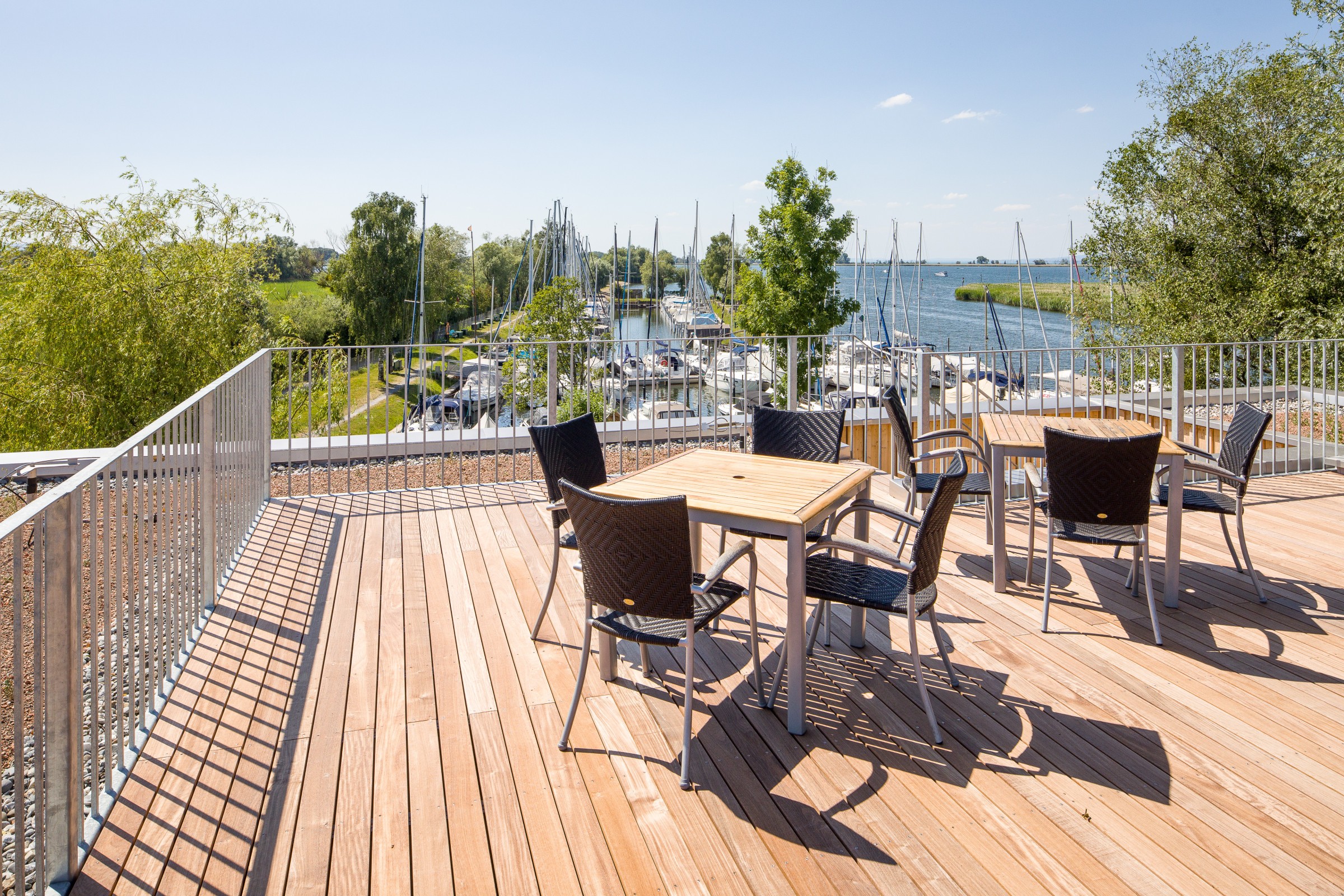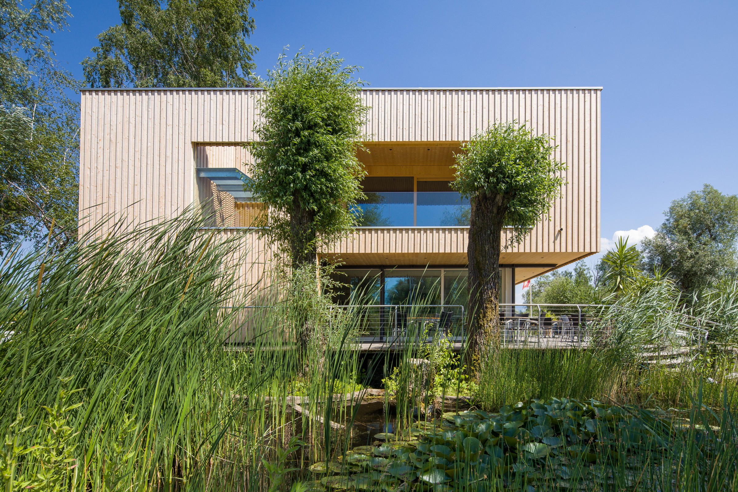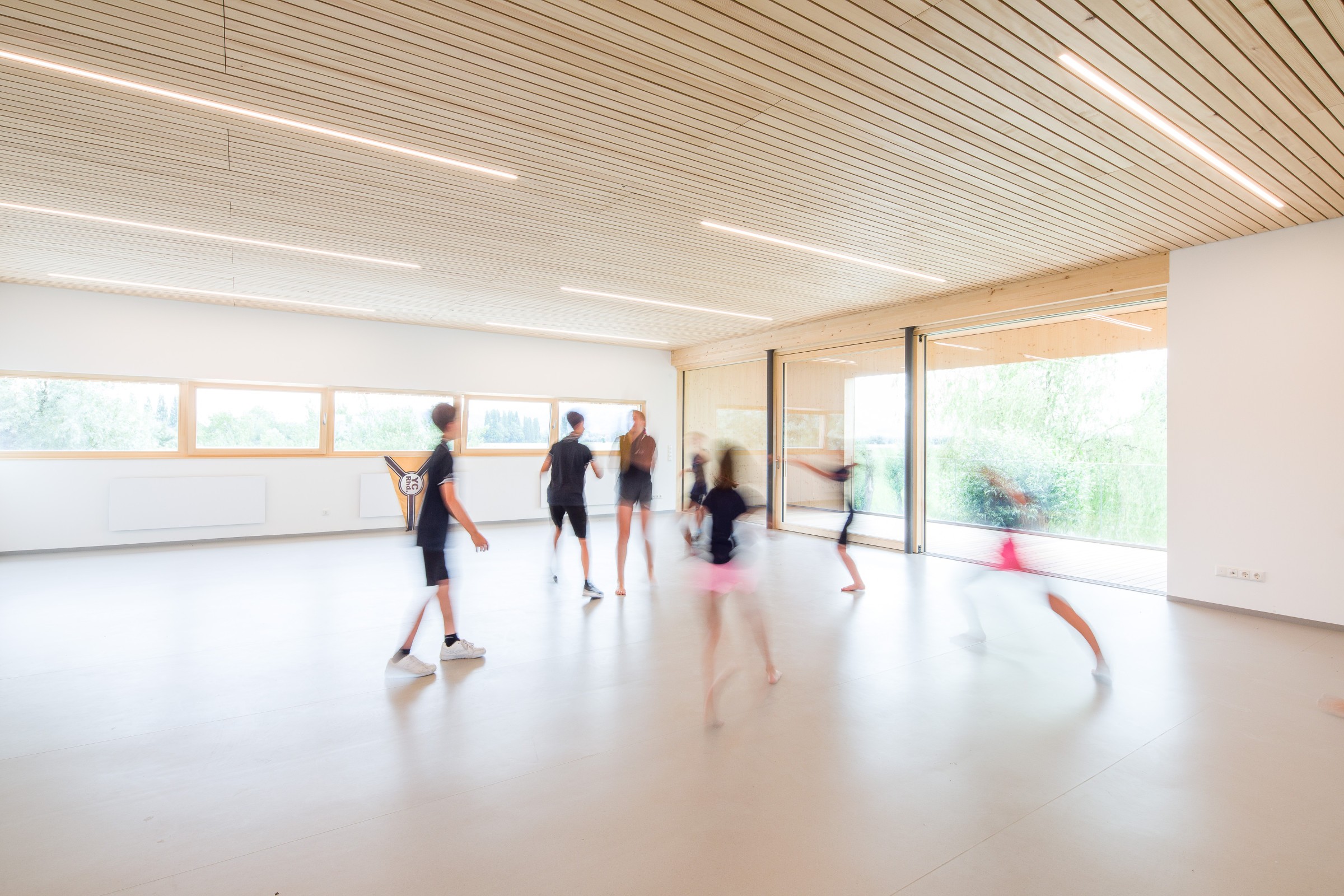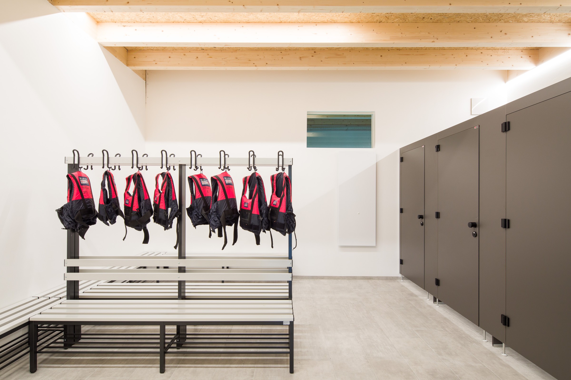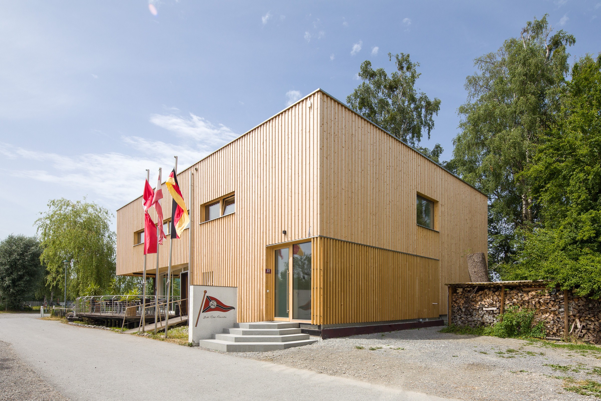Das bestehende Clubhaus wurde vergrößert und aufgestockt, um den Bedürfnissen gerecht zu werden. Neue Sanitärzellen, Umkleiden und ein großzügiger Seminarraum wurden ergänzt. Ebenfalls wurden Lagerflächen geschaffen. 2 Treppenhäuser führen in das Obergeschoss, eines davon führt auf die neue Dachterrasse.