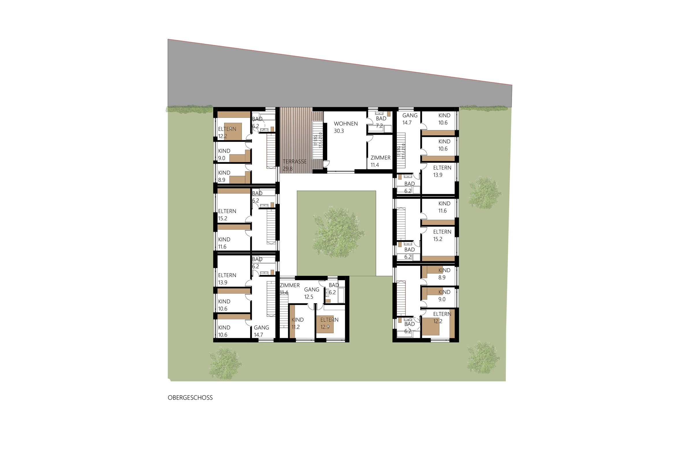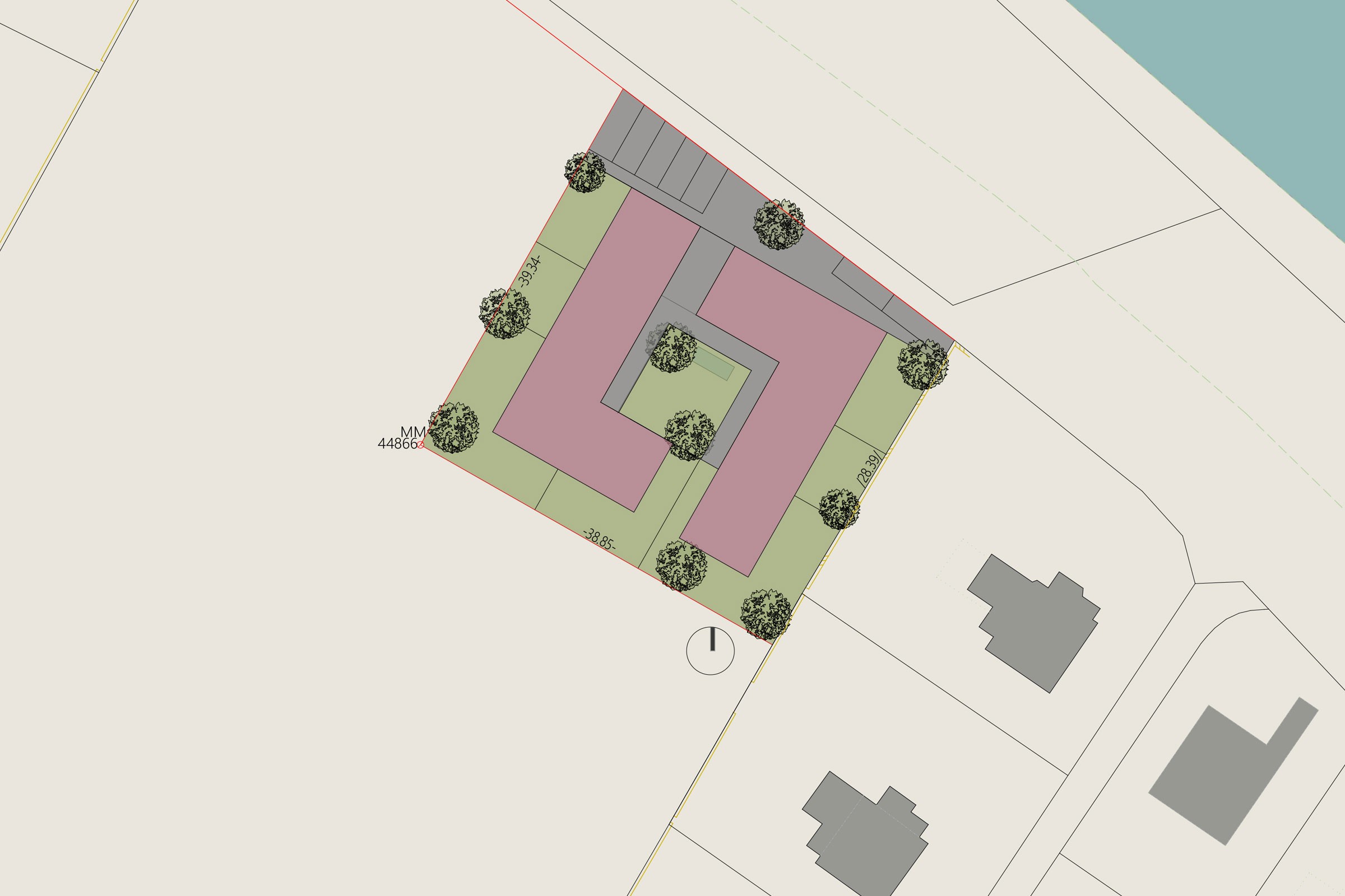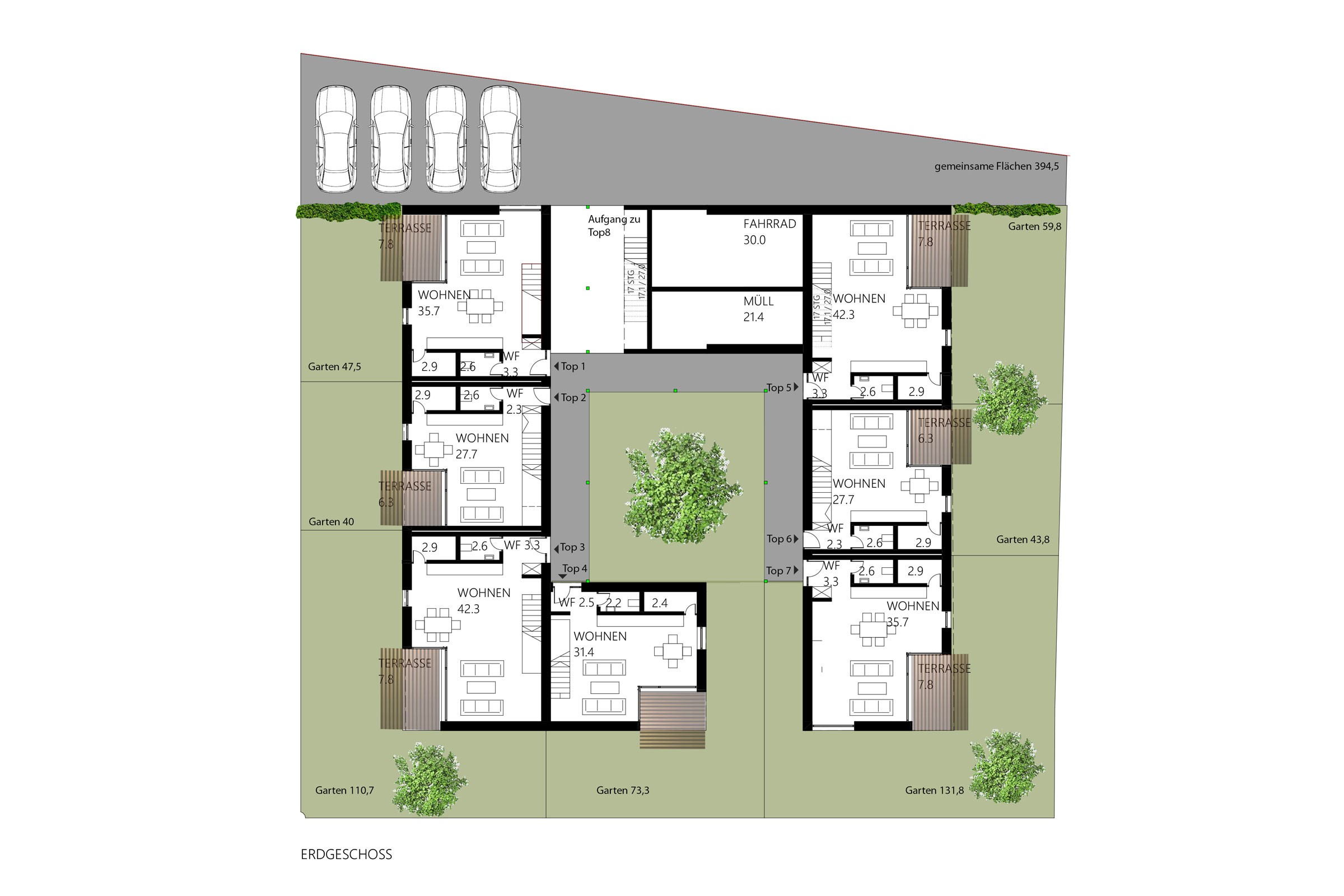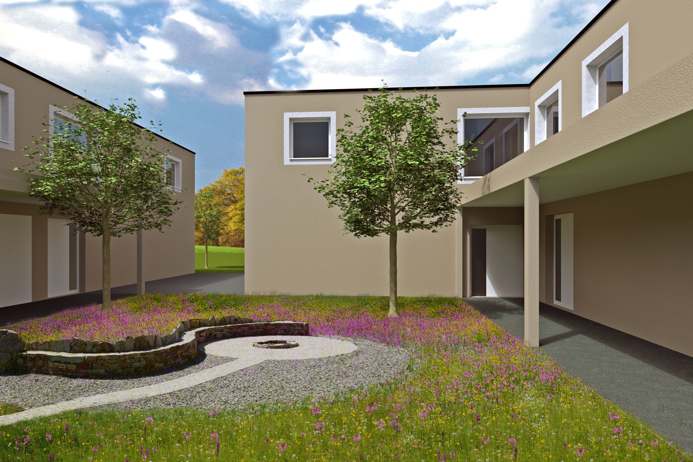 „Gemeinschaftliches Bauen" bedeutet Synergien zu schaffen, um anfallende Kosten wie zum Beispiel Vermessung, Planung, Heizung im Verbund zu lösen. Die Stärke und Größe der Gruppe kann auch dafür genutzt werden, über Masse und Bauvolumen günstigere Preise zu erzielen. Trotz allem bleibt die Individualität erhalten. Das Grundstück wird in vier unterschiedliche Größen je nach Wunsch und Vorstellung eingeteilt. Jeder einzelne tritt als eigener Bauherr und Grundstückseigentümer auf. Dies erlaubt höchste Individualität in Bezug auf Wohnbedürfnisse und deren Vorstellung und die Umsetzung dieser in einen Grundriss.