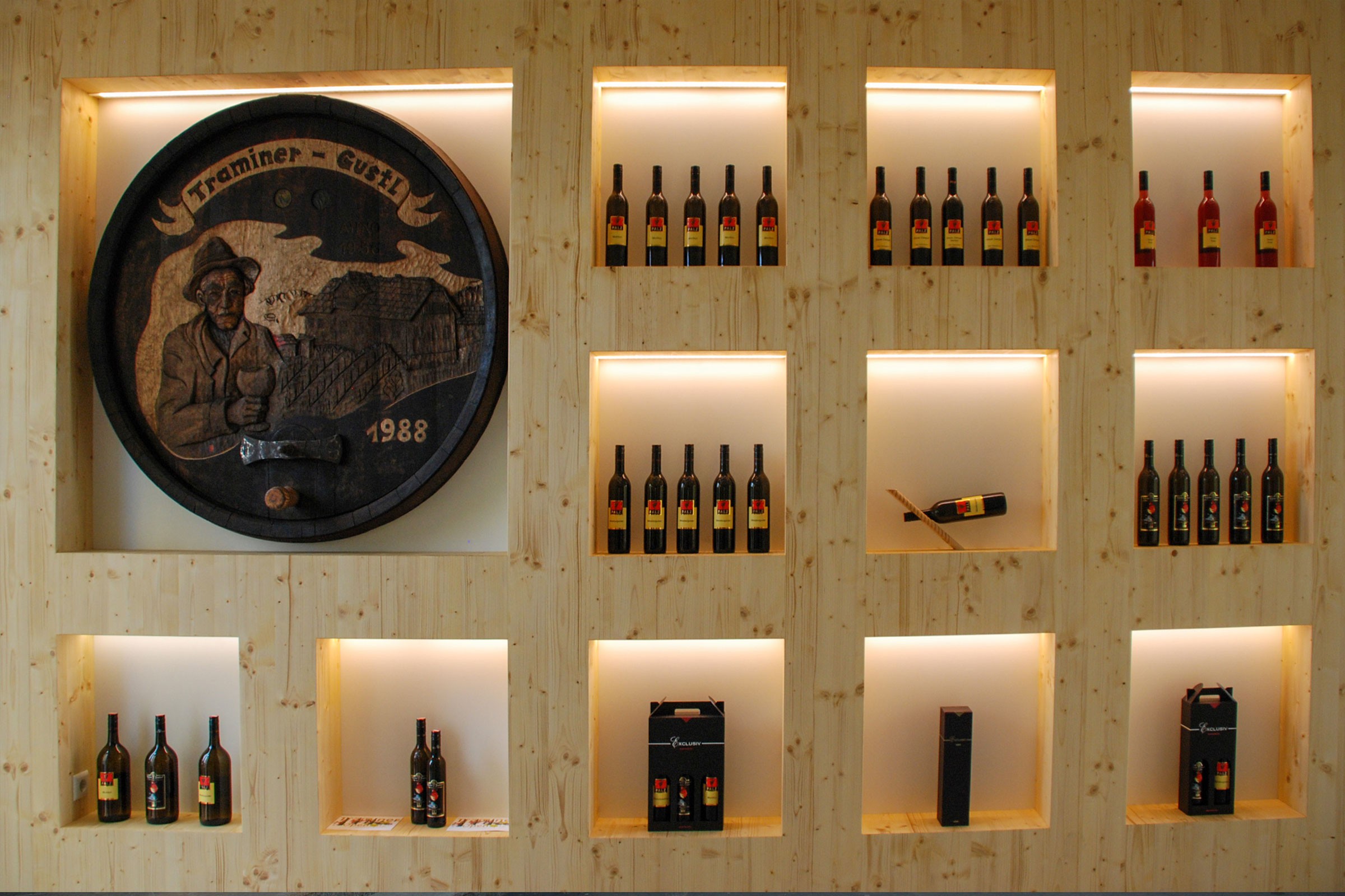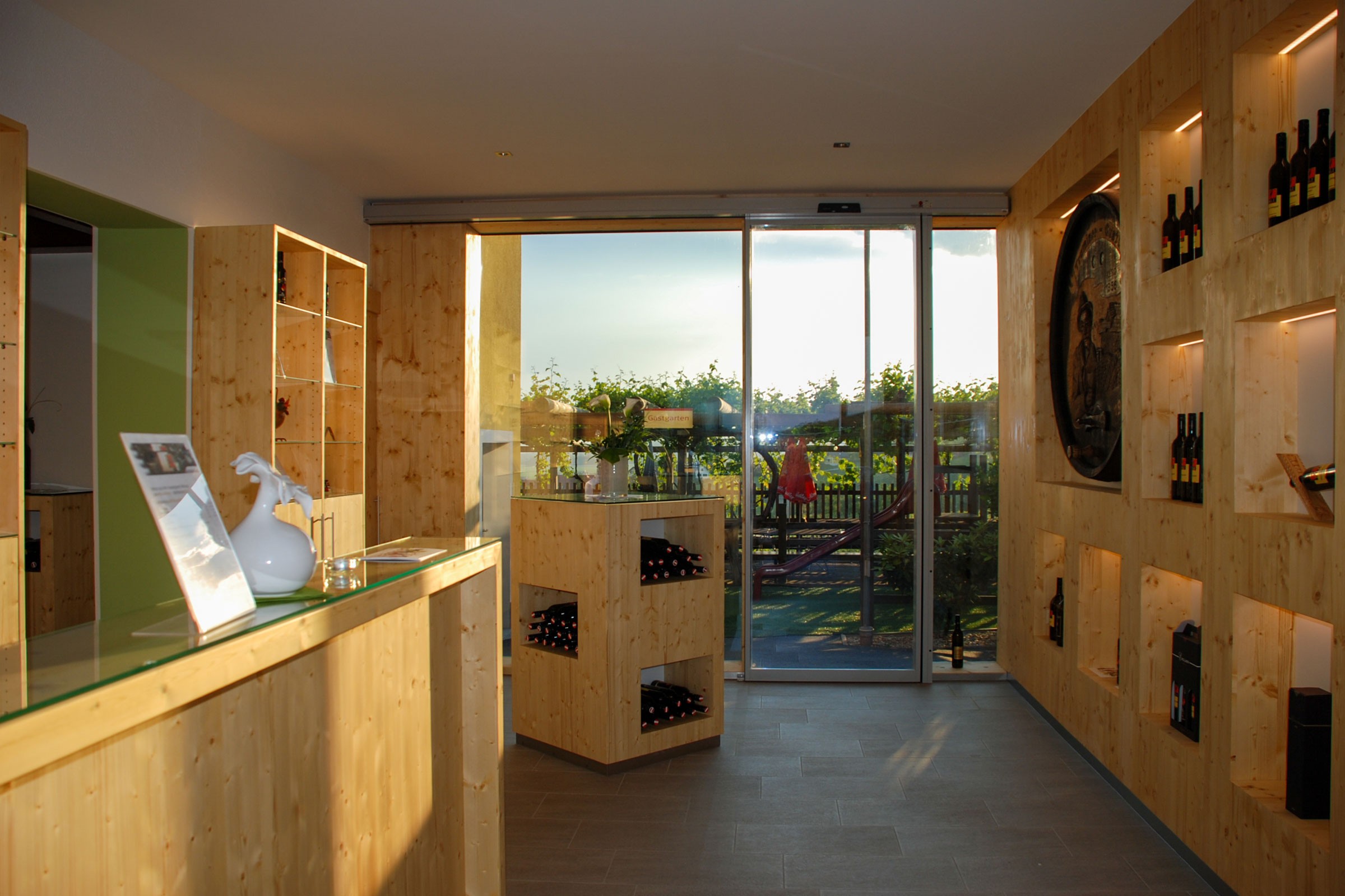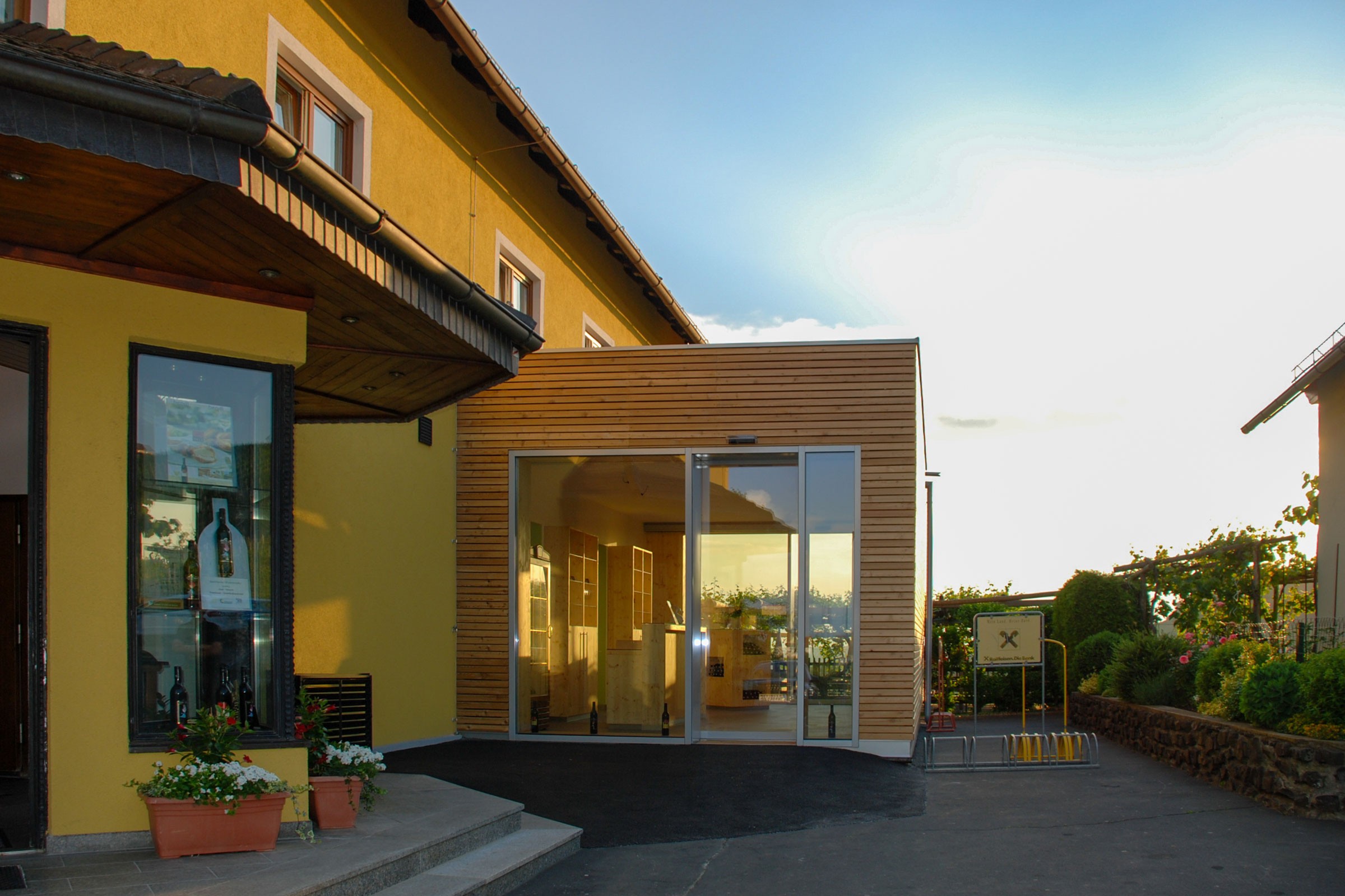 Der Gasthof Palz, bekannt durch seine Backhendl, besitzt auch ein eigenes Weingut und wollte seinen Wein den Gästen auch angemessen präsentieren. Die Idee den Degustationsraum in eine Schnittstelle zwischen Gasthof und Laube zu setzen wo jeder Gast an den Weinflaschen vorbei kommt um dann auch einen guten Tropfen zu kosten, wurde in einem einfachen Baukörper mit raumhohen Verglasungen zu den Weinbergen realisiert. Eine Holzwand mit Quadraten in denen der Wein präsentiert wird schließt den Raum zum Nachbar hin ab.