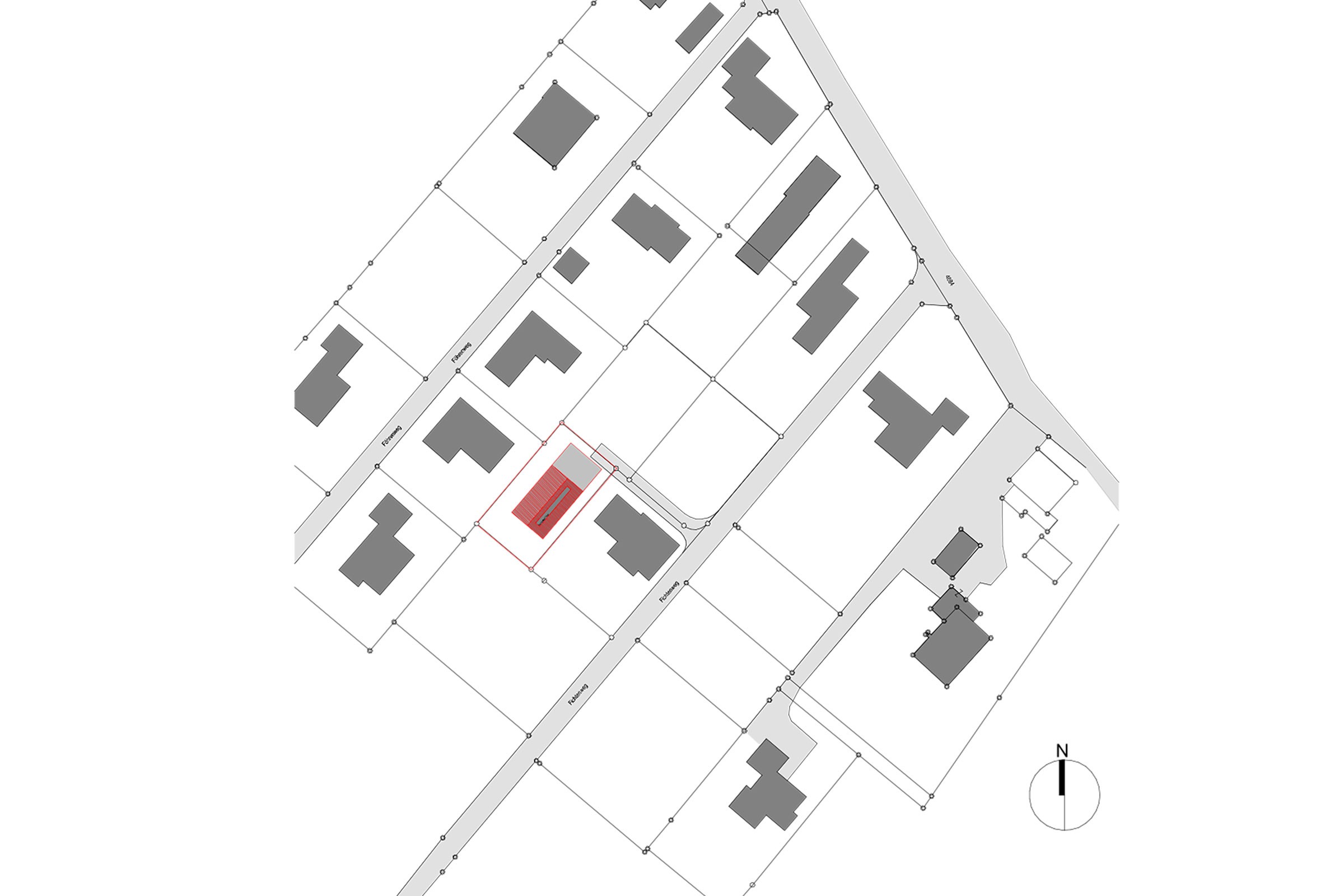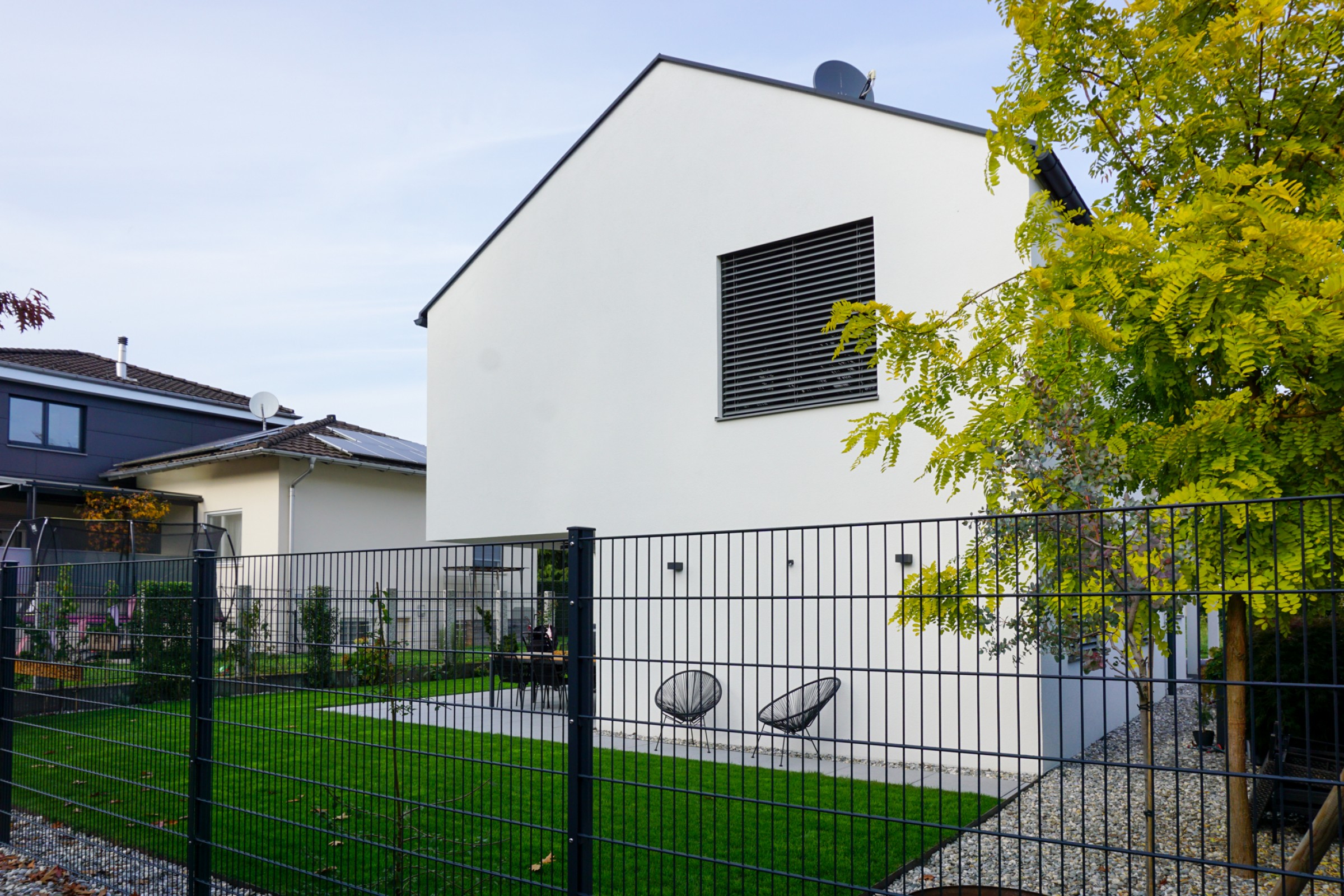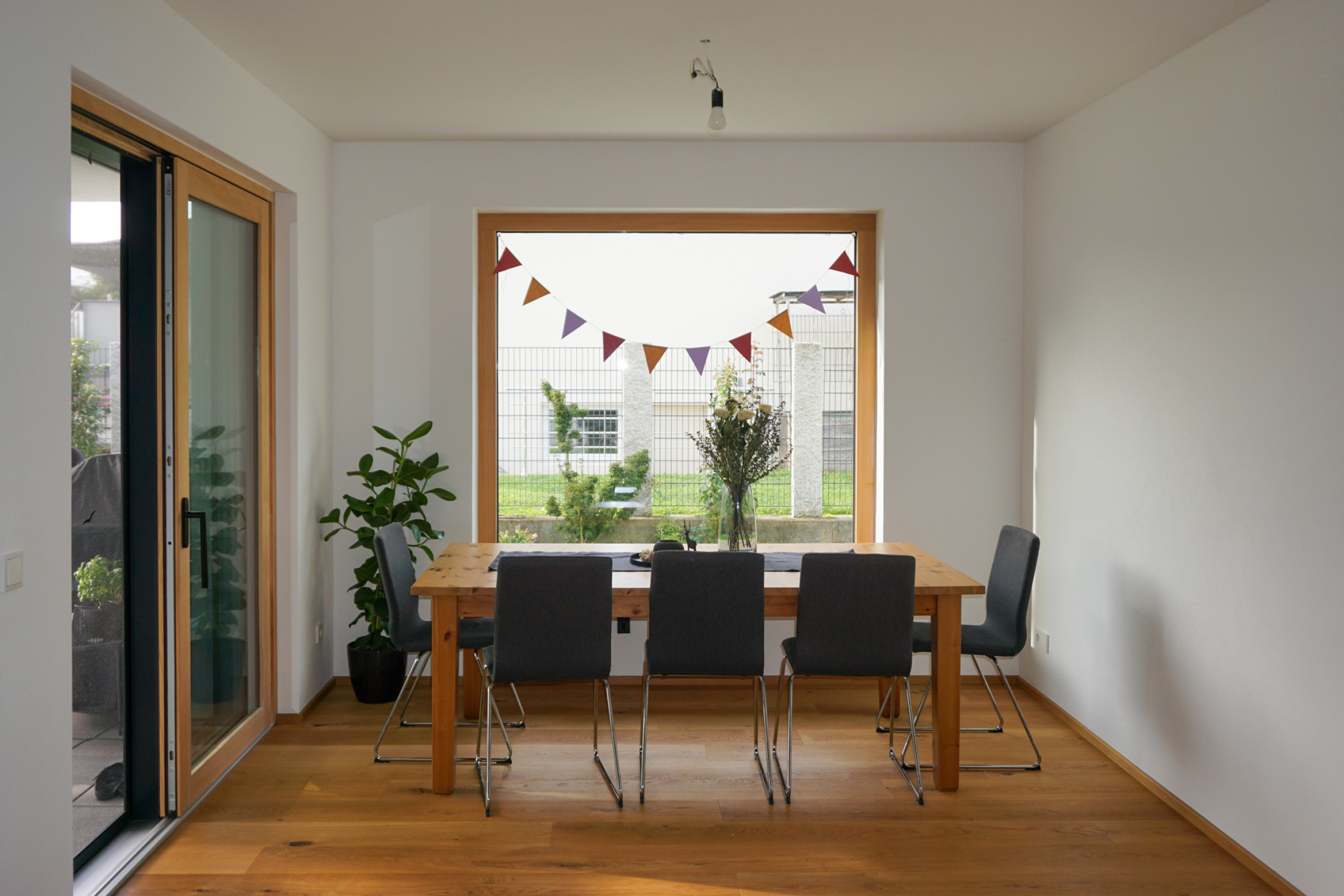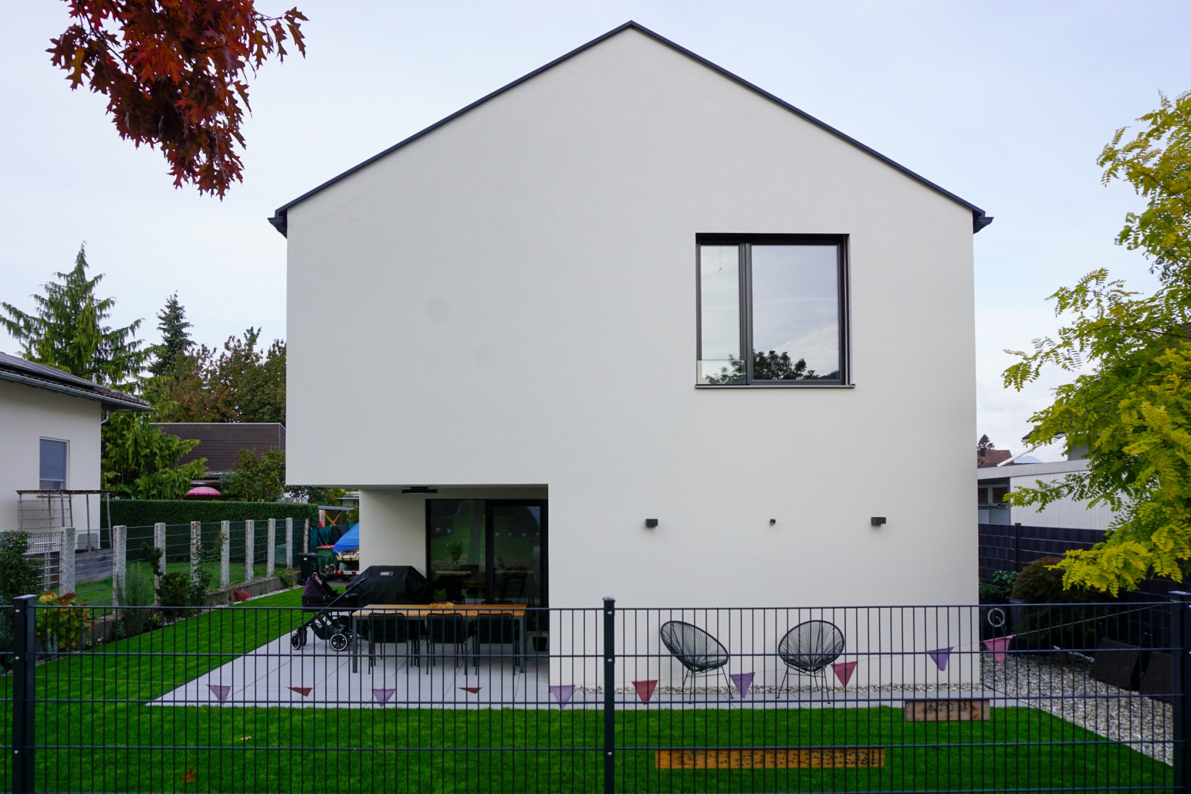 Das Haus wird in Massivbauweise errichtet. Im Erdgeschoss befinden sich die Aufenthaltsräume und Nebenräume. Eine Reduktion von Fenstertypen in der Fassade ermöglichen ein ruhiges Fassadenbild. Ein Giebeldach ohne Dachvorsprung geben der einfachen Gebäudeform eine moderne Erscheinung. Die Räume im Obergeschoss sind offen bis zum Dach, was ein großzügiges Raumempfinden darstellt.