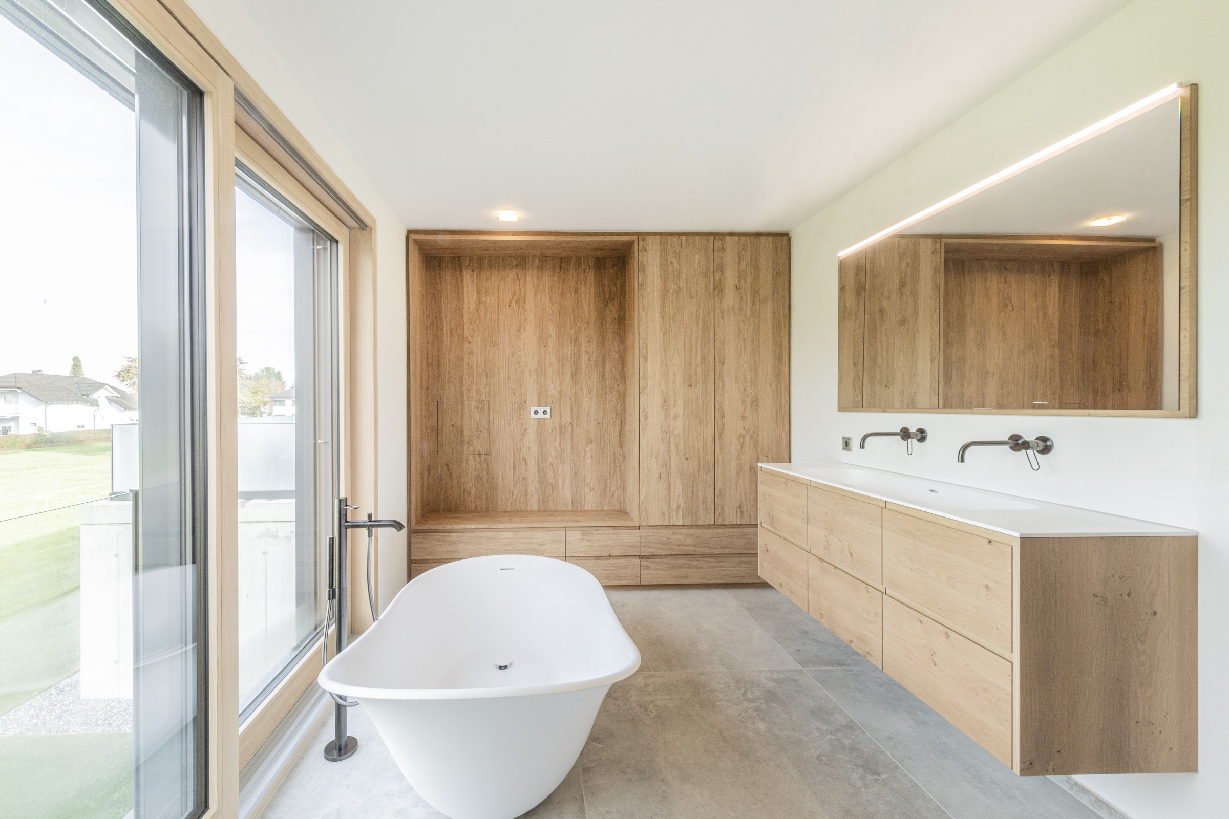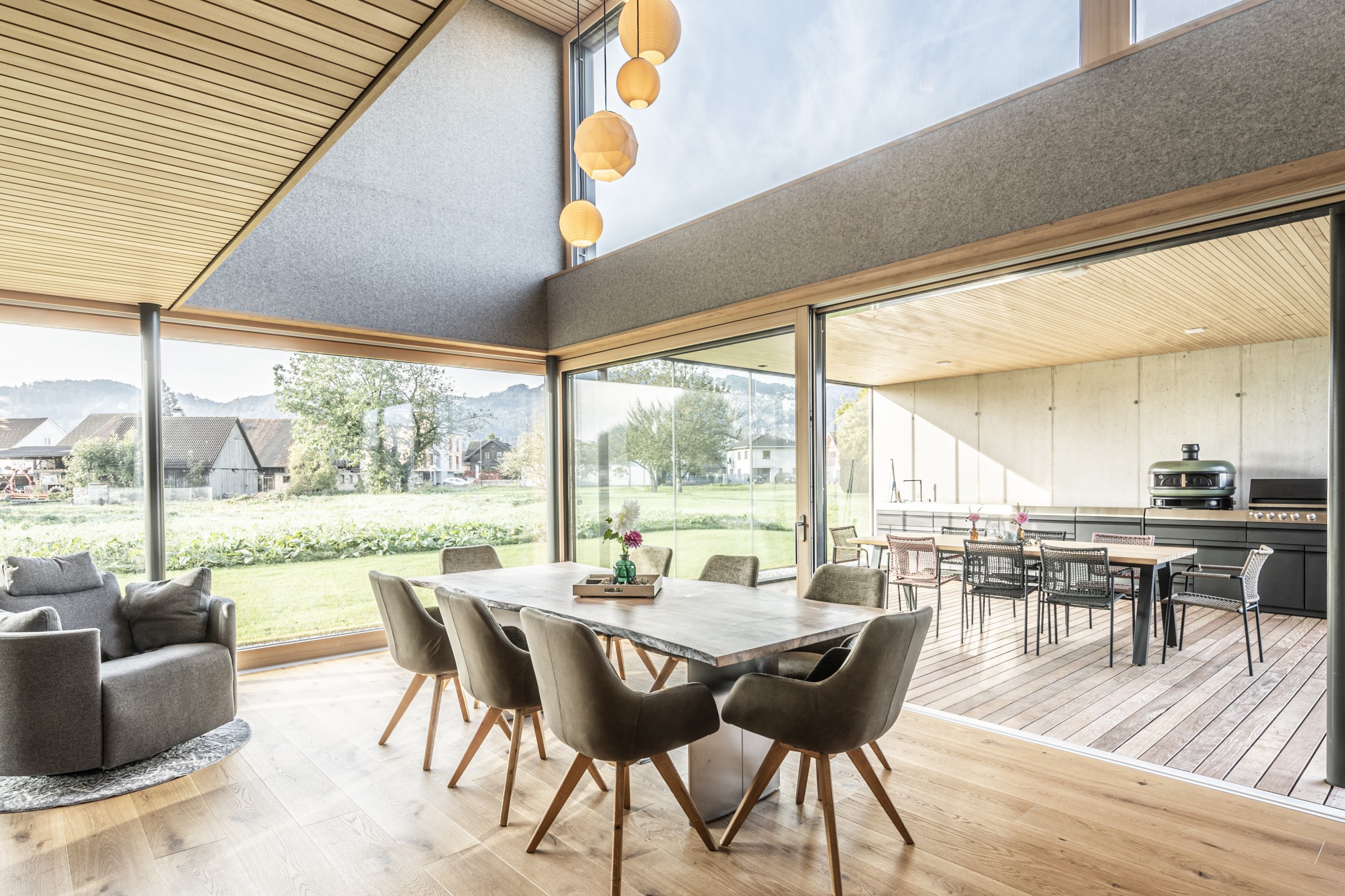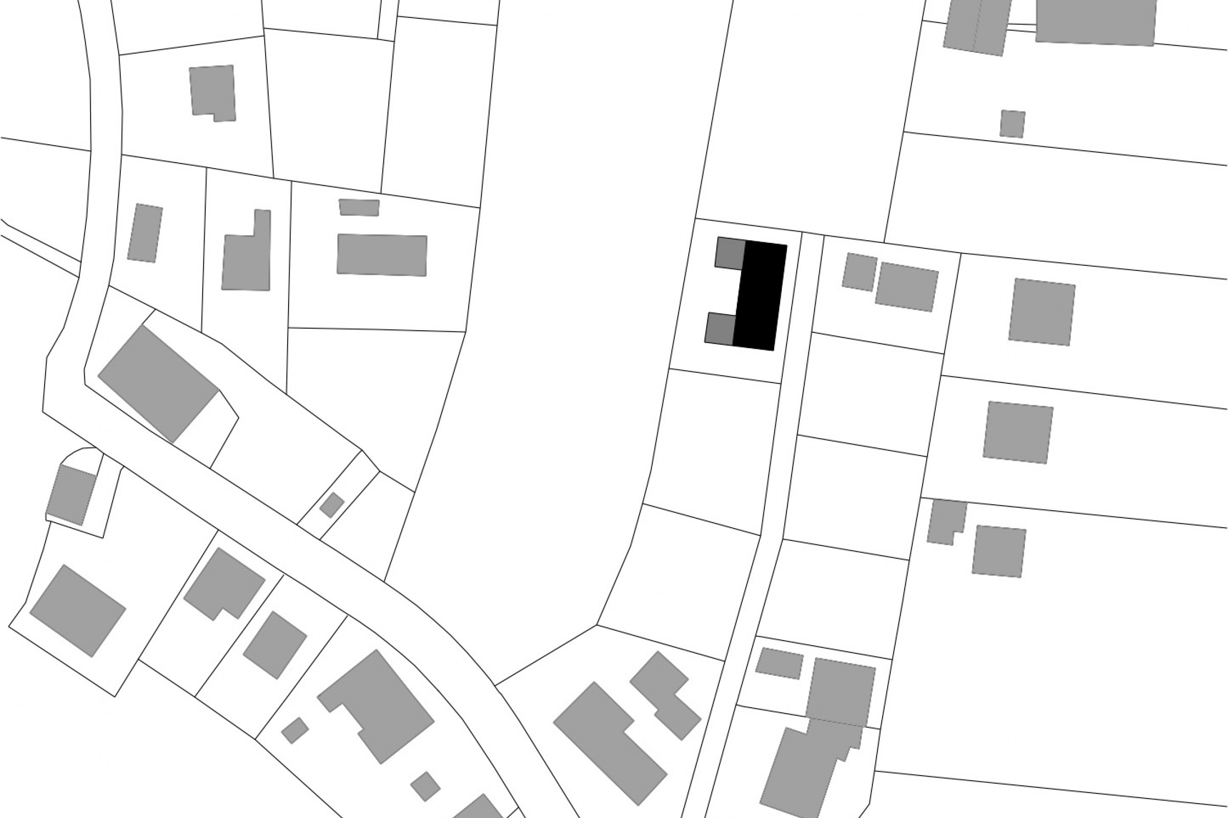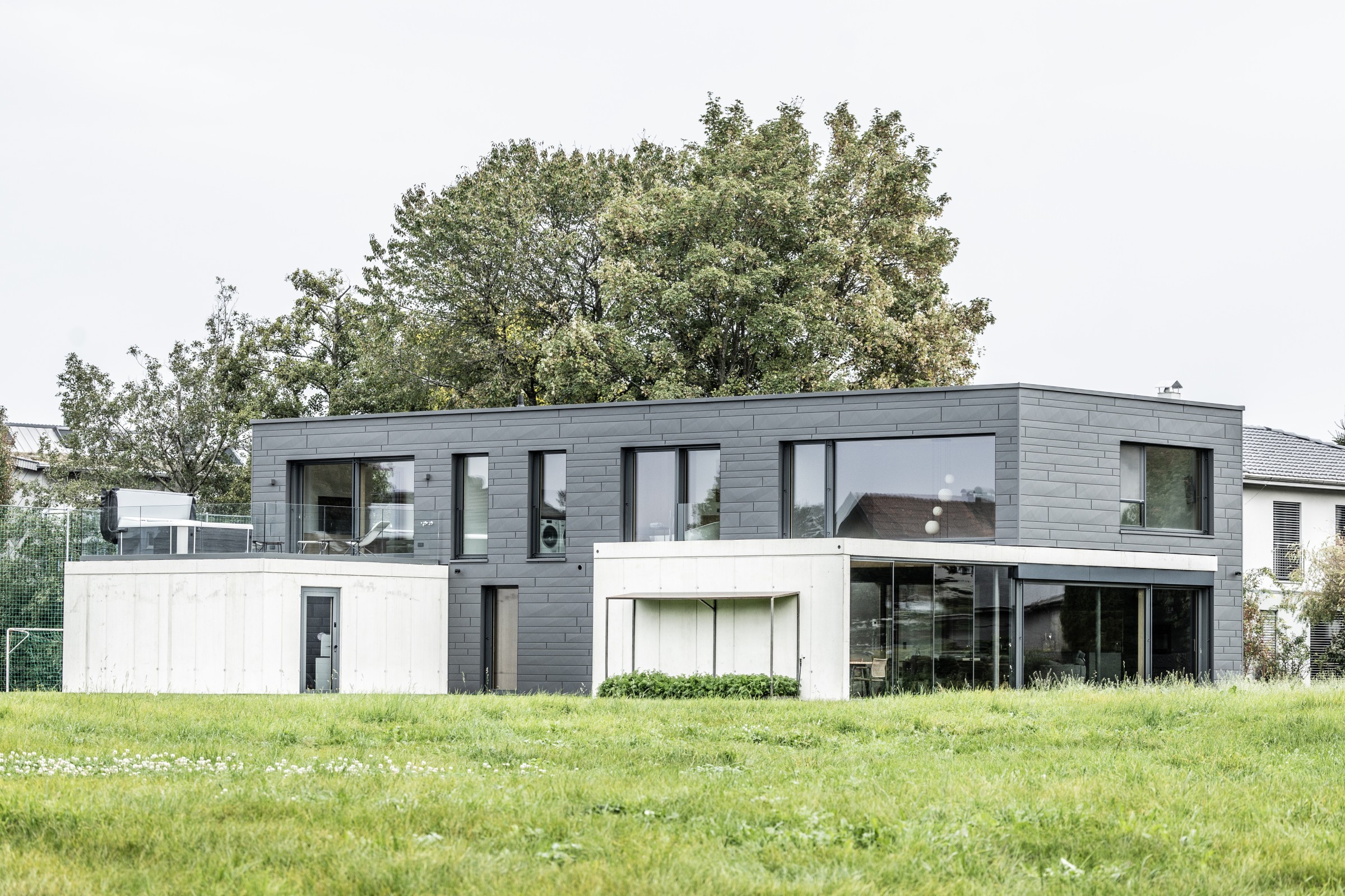 Der Neubau gliedert sich in einen zweigeschossigen Riegel mit zwei seitlich gestellten ebenerdigen Kuben. Dadurch entsteht eine Hofsituation nach Westen hin. Der kompakte Baukörper wird in Massivbauweise errichtet und mit Aluminiumplatten verkleidet. Kombiniert mit Holzelementen, die in den Rücksprüngen an Wänden und Decken eingesetzt werden, sowie den Holzlamellen als Abschluss der Garagenwand, entsteht eine angenehme Erscheinung des Gebäudes.