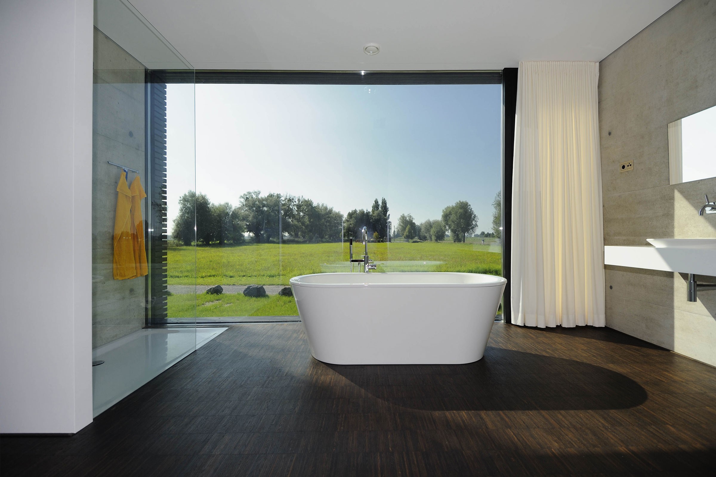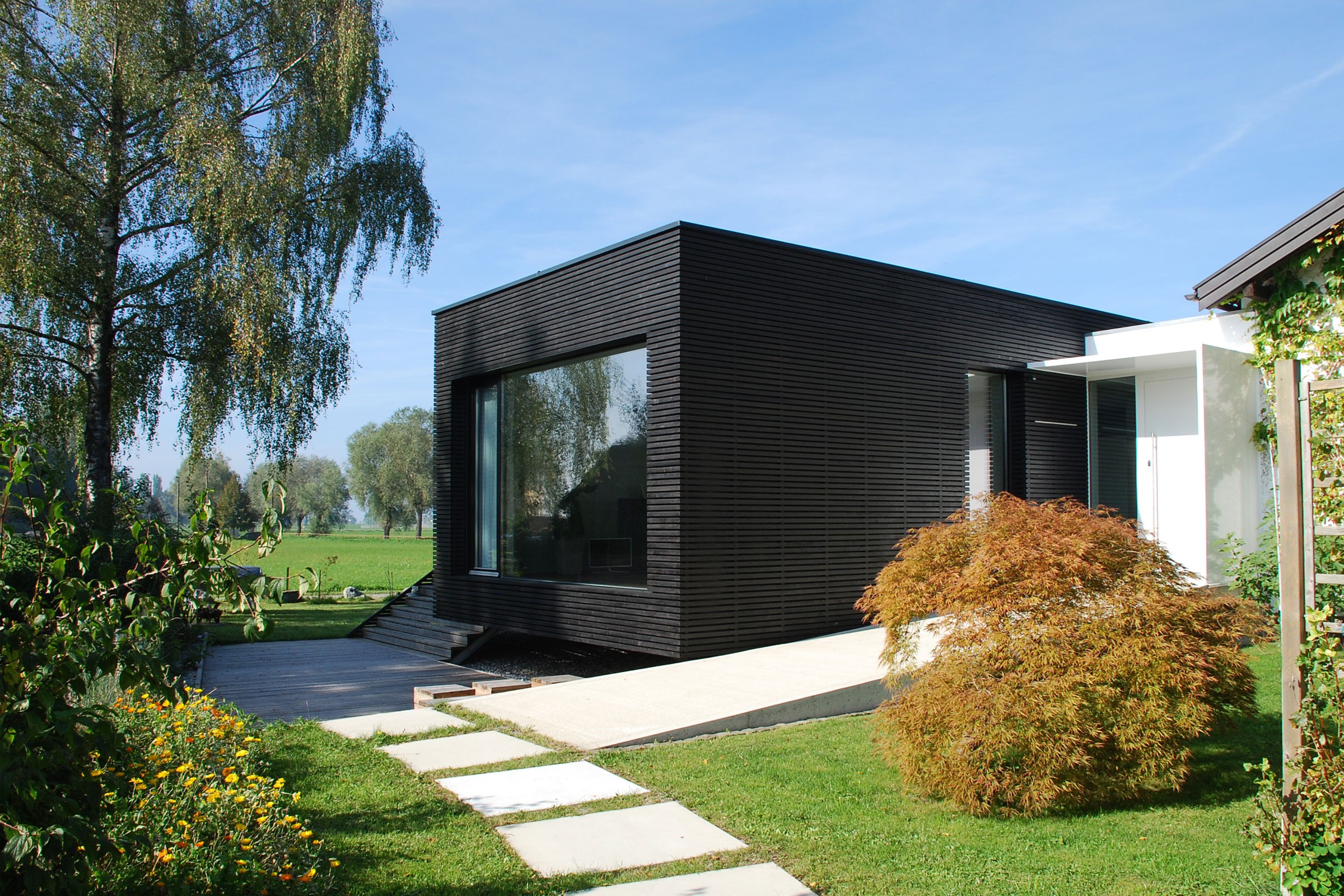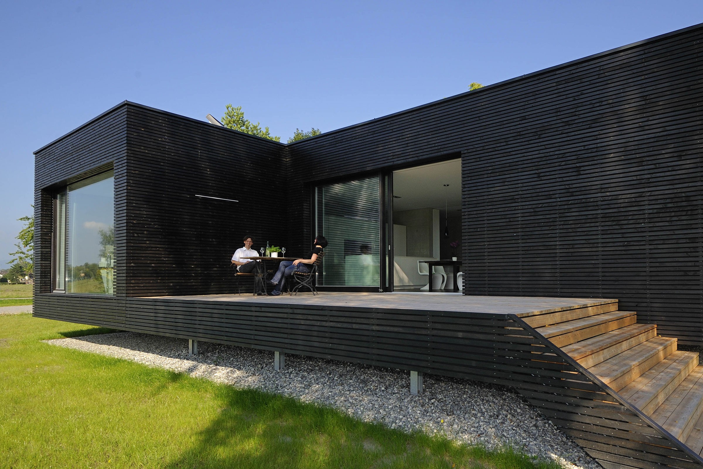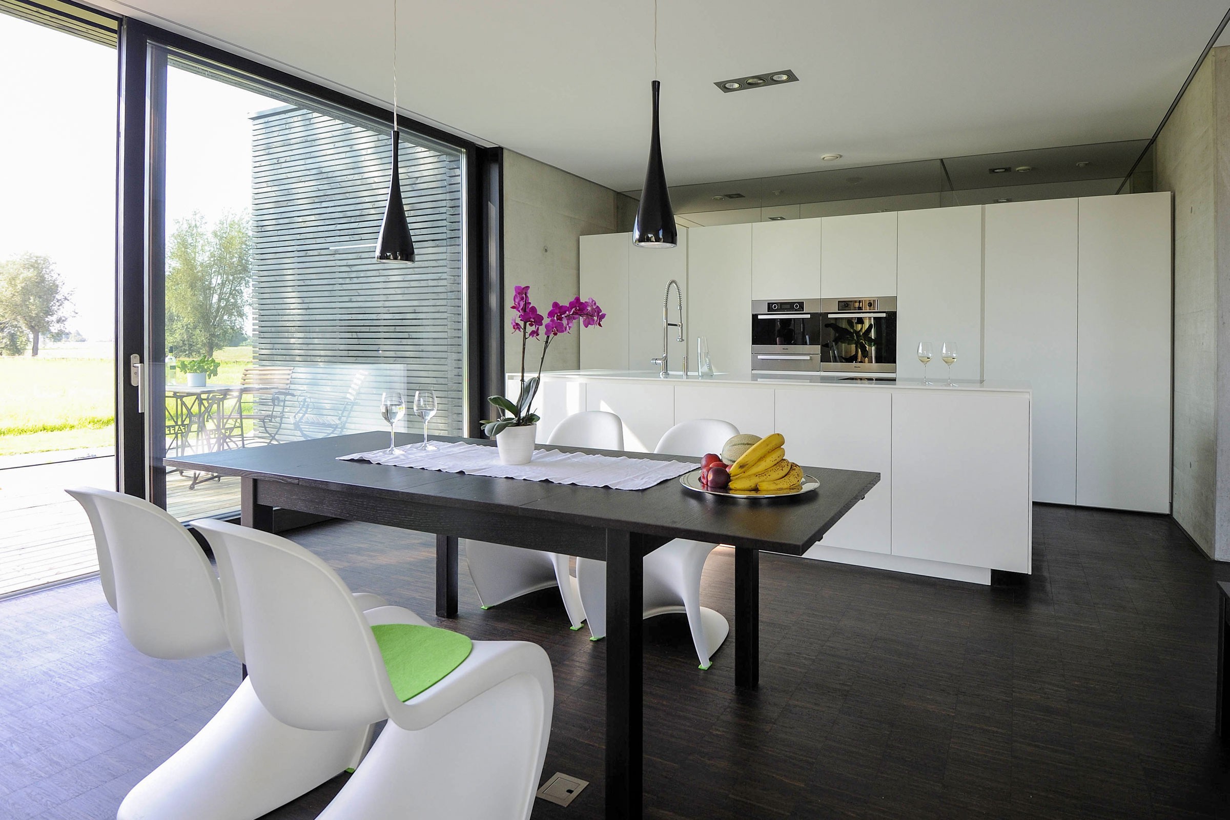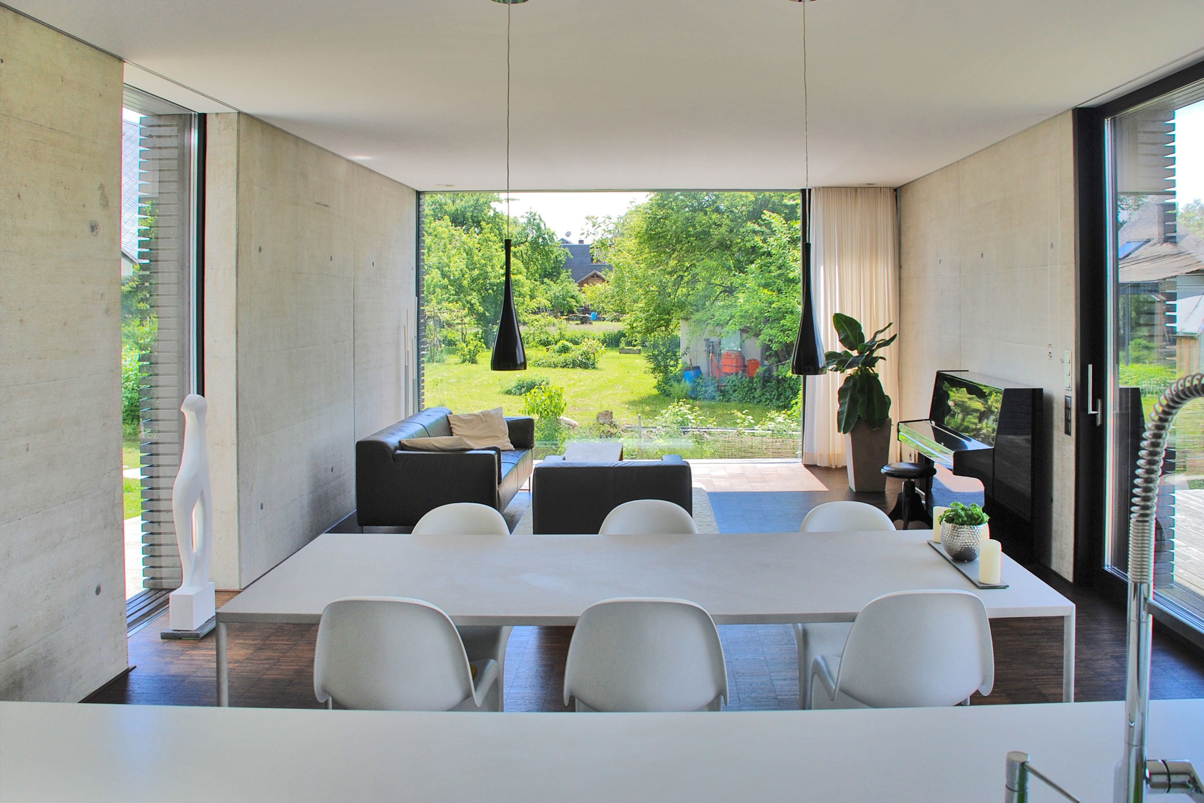 Das Gebäude ist modulhaft aufgebaut und hat eine Längserstreckung von 18 Metern. Die Breite der beiden Riegel beträgt 6 Meter. Das Wohnhaus besteht aus einem UG und einem EG das dreiseitig über das UG auskragt. Die Räume fließen aufgrund der vollständigen Öffnung der Stirnseiten durch rahmenlose Verglasung des Riegels in die Landschaft über und geben somit Blicke nach Innen und Außen frei. Die Innenwände wurden in Sichtbeton ausgeführt. Ein Oberlicht zwischen Küche, Ankleide und Schlafzimmer lässt den Bewohner auch im Innenbereich die volle Länge des Baukörpers spüren.