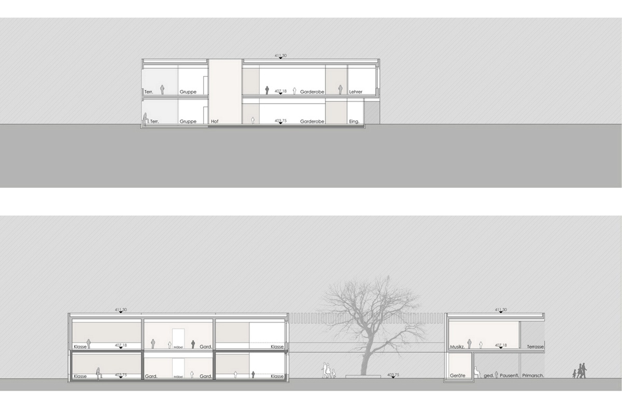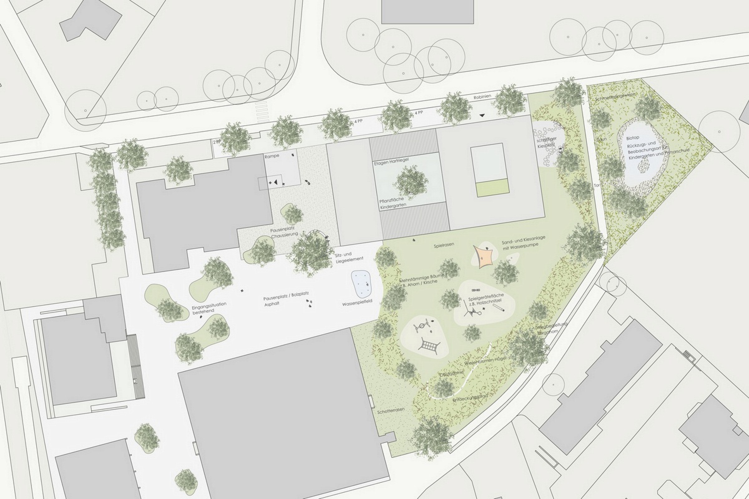 Wettbewerb in ARGE mit Arch Peter Muxel, Lustenau Der Wettbewerbsperimeter für die Erweiterung des Kindergartens Blattacker wird im wesentlichen durch die Volumen der Primarschule. der Sporthalle, den Wohnbauten im Süden und Osten und der Position des bestehenden Kindergarten bestimmt. Der Entwurf wurde aus dieser Bestandssituation entwickelt. Die Längen- und Höhenentwicklung des neuen Baukörpers orientiert sich an den Gebäuden des ortsbaulichen Umfeldes.