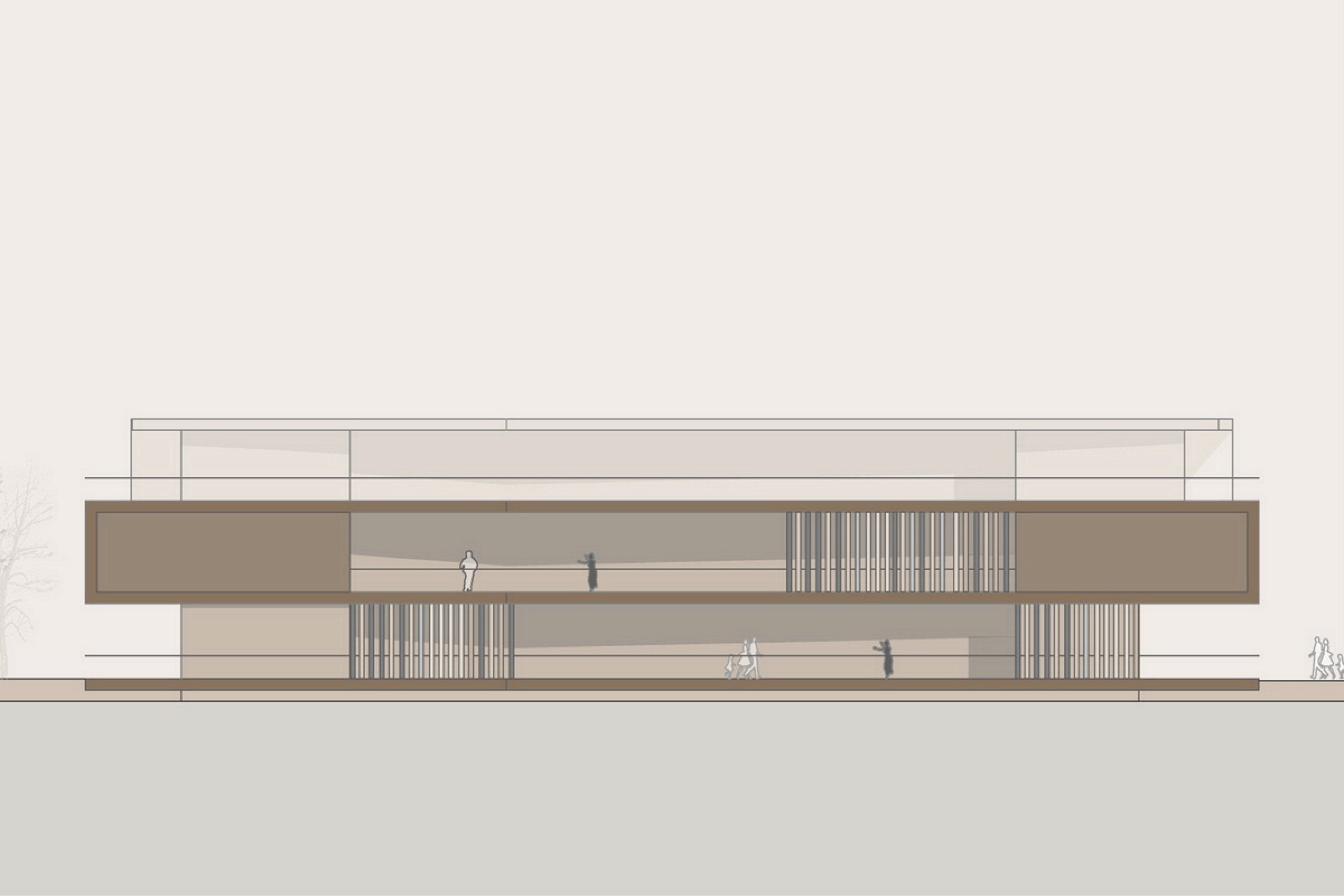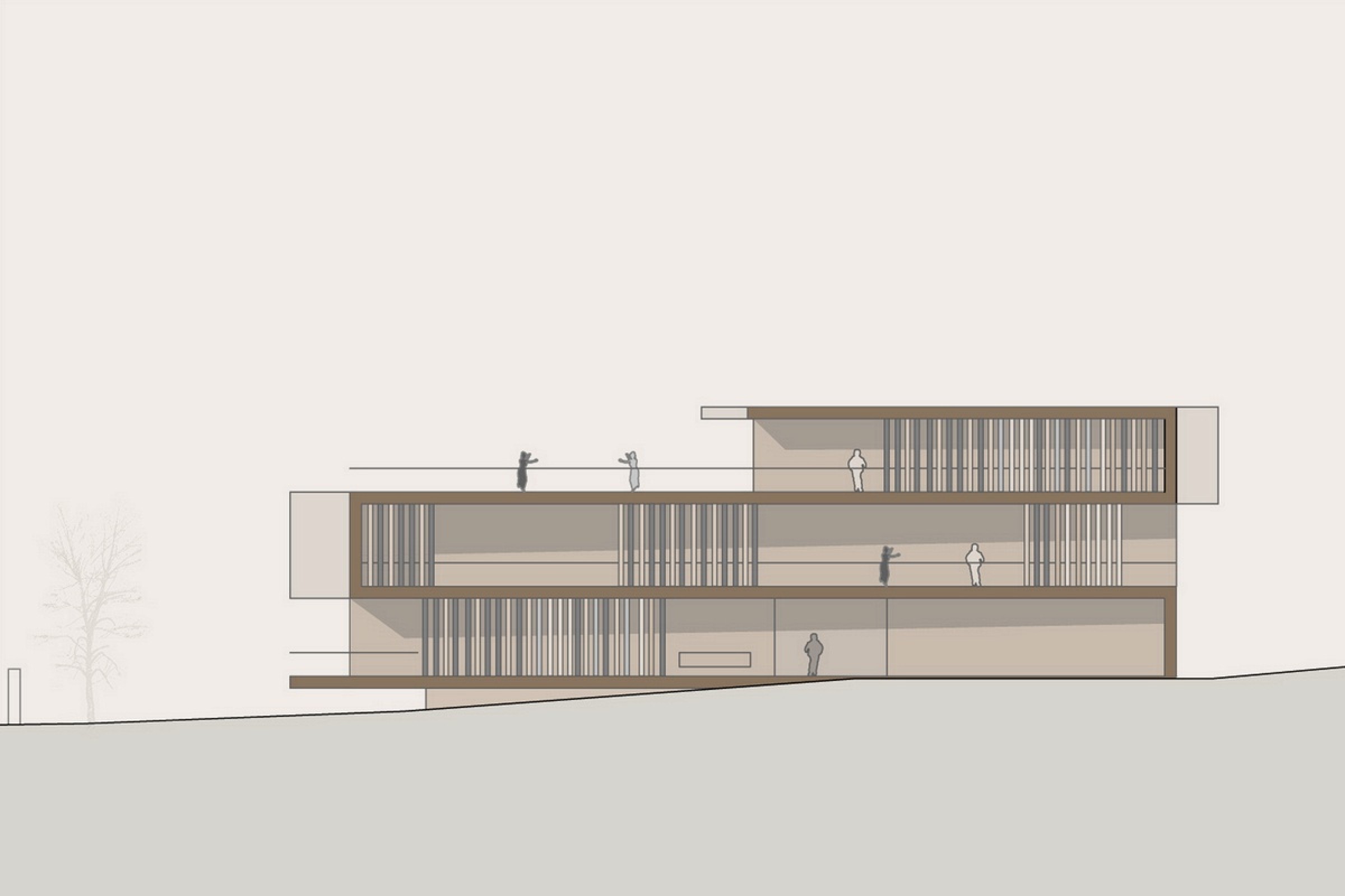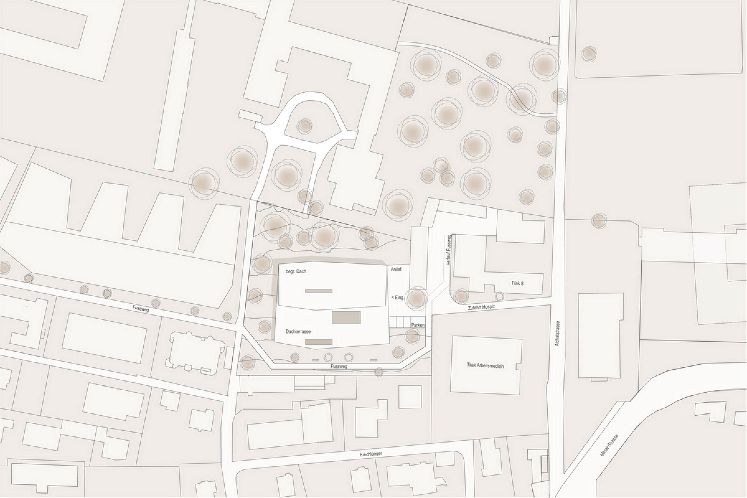 Wettbewerb in ARGE mit Arch Peter Muxel. Das Wettbewerbsgebiet des Hospizhauses Tirol liegt eingebettet in eine dicht bepflanzte Parkanlage, umgeben von Wohnhäusern und grösservolumigen Gebäuden der TILAK und des neuen Schulzentrums Hall. Die sanfte Hanglage erlaubt spannende Ausblicke in die umgebende Berglandschaft. Das neue Volumen wird aus dem städtebaulichen Kontext heraus entwickelt. Die Baukörperstellung. Längen und Höhen orientieren sich an den umgebenden Bauten. Durch die leichten Abknickungen wird der Baukörper in seiner Gesamtgröße gegliedert, der Aussenraum kann durchfließen. Ein angemessen dimensionierter Vorbereich für das Ankommen der Patienten und Besucher ist dem Eingang im Osten vorgelagert. Der bestehende Fußweg wird südseitig am Gebäude vorbeigeführt.